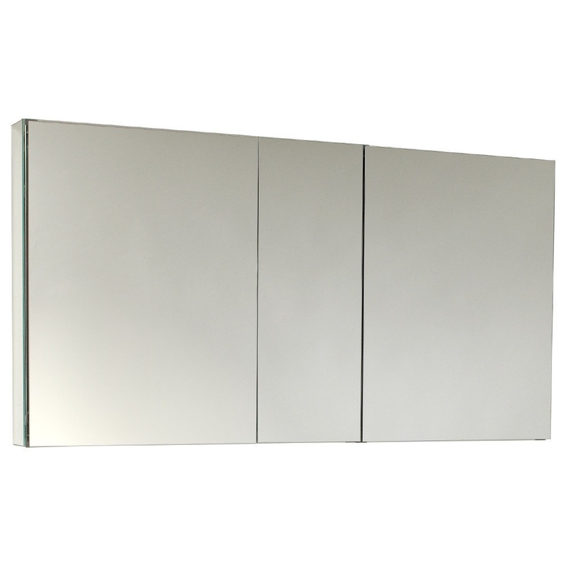 This 50" medicine cabinet features mirrors everywhere. The edges have mirrors and also on the interior of the medicine cabinet. The inside features four tempered glass shelves. Can be wall mounted or recessed into the wall. -Dimensions: 49"W x 26"H x 5"D -