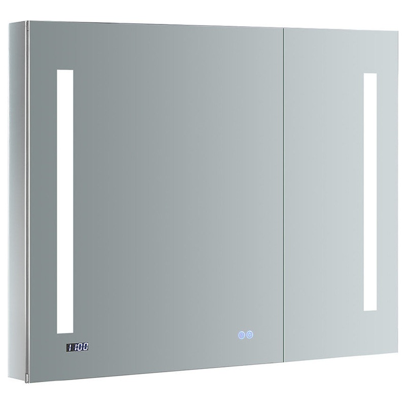 This stylish Fresca Bathroom Medicine Cabinet meets the demands of today’s busy lifestyle, putting modern convenience right in front of you. On the outside, it’s a sophisticated, frameless mirrored medicine cabinet with touch switches for a built-in dimmable surface LED task light, as well as a defogger. Inside, you’ll find three adjustable glass shelves ideal for holding items of varying sizes. The double-sided mirrored doors swing 170 degrees on soft-close BLUM hinges and the back wall of the cabinet is also mirrored. There’s an infrared touch switch for the interior LED light which allows you to find what you’re looking for at any hour. There’s also a handy electrical/USB outlet combo inside for an electric shaver, toothbrush or other essentials, making your morning and evening grooming tasks easier than ever. A brilliant combination of elegance and convenience, the simple frame and neutral tone of the Fresca Bathroom Medicine Cabinet will beautifully complement any dcor. It can be wall mounted or recessed and features an anodized aluminum frame which creates a moisture and dust resistant interior. Both mirrored doors have plastic corners. In addition to all of these great features, this particular style is equipped with a digital clock option. This medicine cabinet measures 36″W x 30″H x 5″D and is available in several sizes. Fresca FMC013630 Features: Covered under Fresca’s 3 year warranty Constructed from IP44 rated anodized high quality aluminum frame, with copper-free silver mirrors High quality finish will resist rust and corrosion through everyday use French doors open from the center Recessed or surface mount installation High output LED lighting with dimmable touch switch for surface LED task lights 3 adjustable glass shelves Mirror is frameless with a flat front Includes a defogger operated by a mirror mounted touch switch 2 mirrored doors with mirrored back wall Fresca FMC013630 Specifications: Height: 30″ (top to bottom) Width: 36″ (left to right) Depth: 5″ (front to back) Number of Doors: 2 Rough In (Wall Opening): 34-5/16″ W x 28-3/8″ H x 3-3/4″ D (for recessed installation) Number of Shelves: 3 Power Type: Hardwired Wattage: 120Similar Products: FMC013030: 30″ x 30″ medicine cabinet FMC013036: 30″ x 36″ medicine cabinet FMC013630 (This Model): 36″ x 30″ medicine cabinet FMC013636: 36″ x 36″ medicine cabinet FMC014830: 48″ x 30″ medicine cabinet FMC014836: 48″ x 36″ medicine cabinet