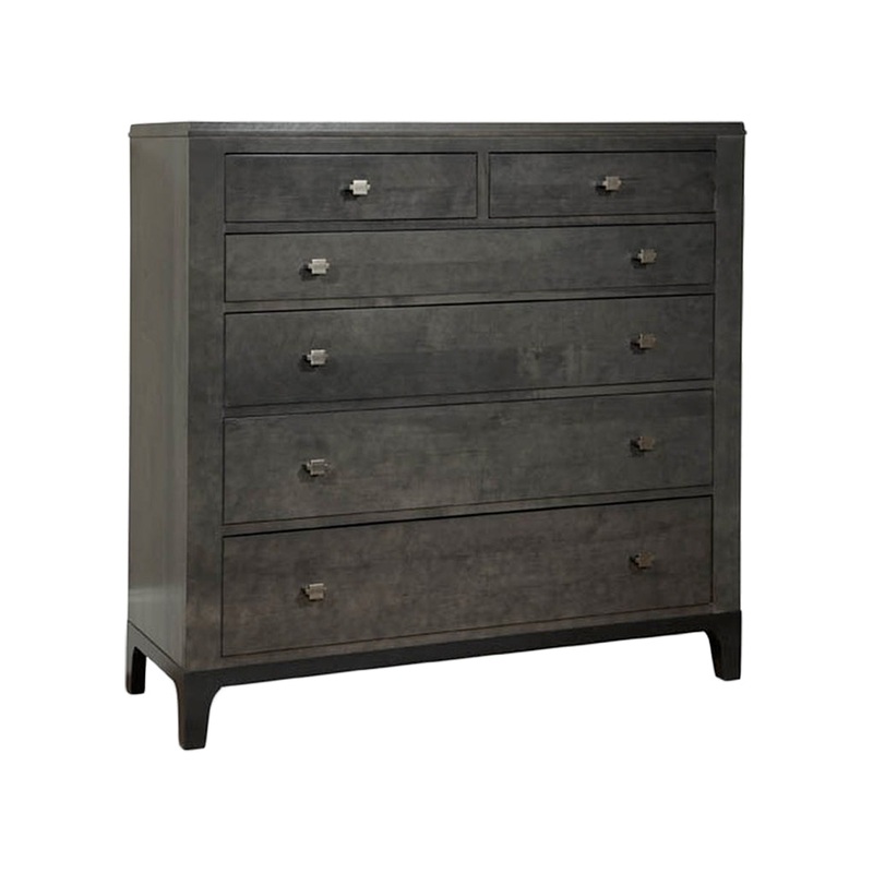 The Front Street Dressing Chest by Durham is a solid wood chest with a contemporary style. This six drawer chest features graduated drawers that increase in size as they go down the case- this presents a stylish balanced apperance. Soft close drawer glides keep your items protected and secure while select chests feature felt-lined drawers or jewelry liners to protect your valuable collection. The black metal flank base is custom unless otherwise specified when ordering. The Front Street Dressing Chest is a non-cancellable item.