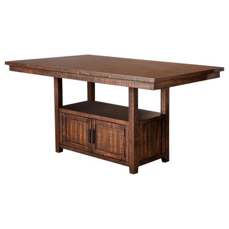 This handsome rectangular wood counter height table from Furniture of America Beverly collection makes the perfect addition to a rustic dining space with a modern farmhouse style. Fashioned from solid wood and wood veneer in a rustic distressed dark oak finish, this versatile table offers a bottom storage cabinet base, adorned with black antique drawer pulls, and accommodates up to six.