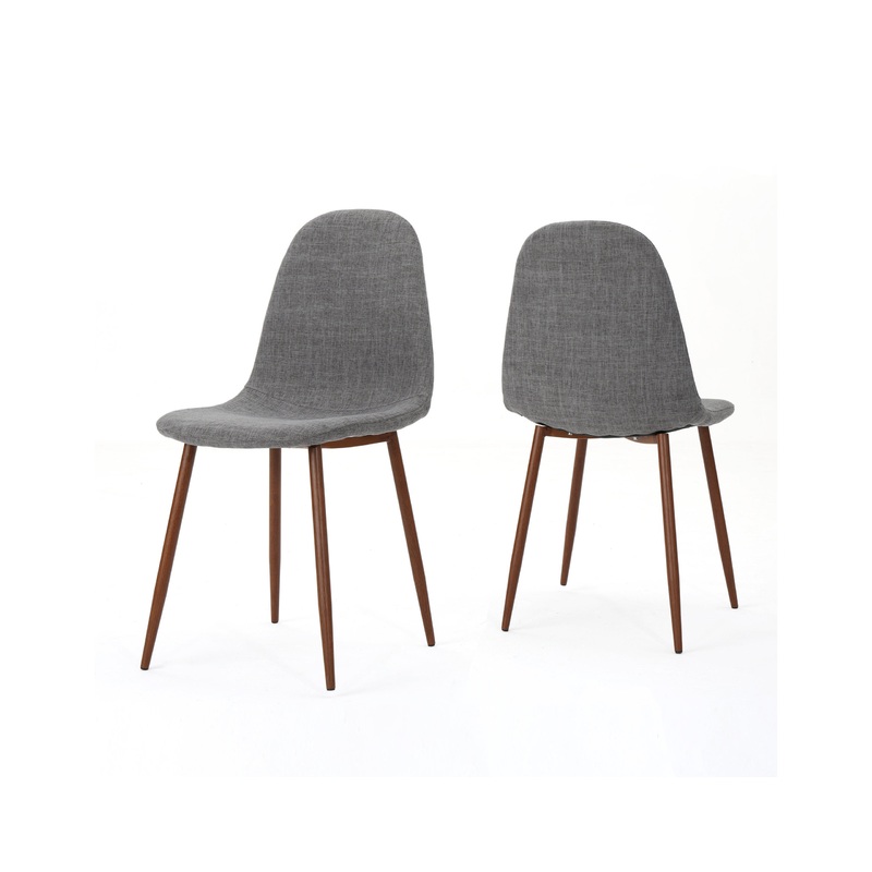 These refined dining room chairs offer the ultimate in comfort with the most minimal of designs. Upholstered in the highest-quality fabric, the contoured seat rests atop understated legs made from iron with a wood finish, giving you the aesthetic look of wood with the durability of metal. The result is a chair that is both incredibly strong and incredibly beautiful.