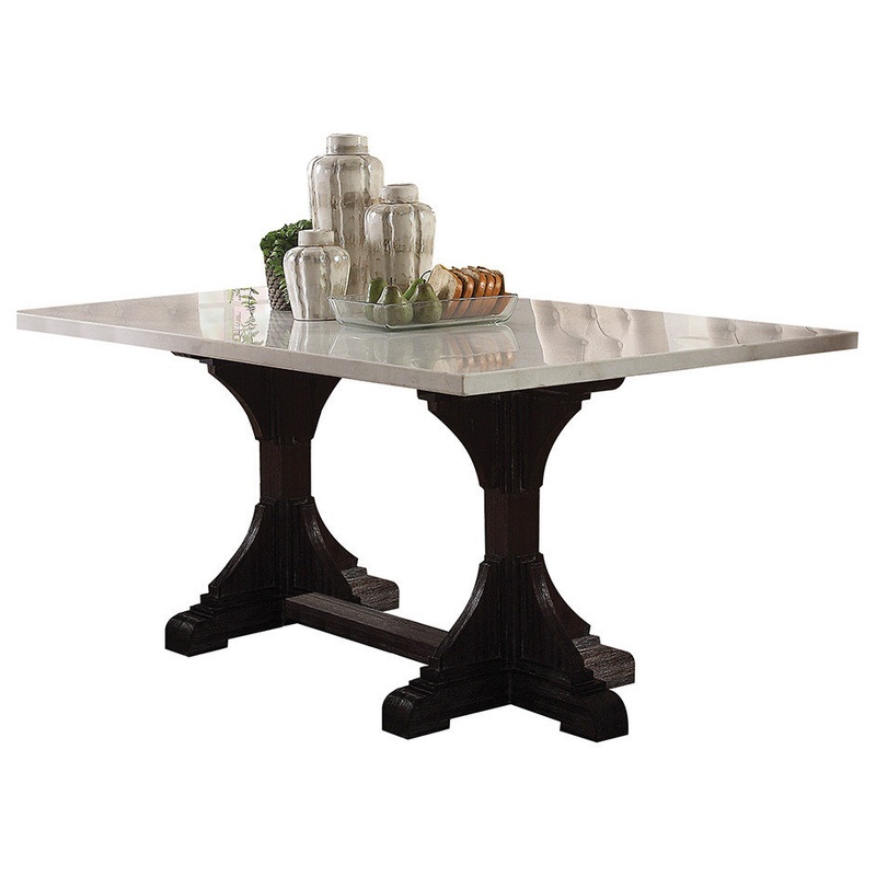With smooth white marble over a weathered espresso trestle base, the Gerardo dining table demonstrates the easy elegance of transitional design. Matching side and arm chairs feature button tufted seat backs and tapered wooden legs in the same lovely weathe