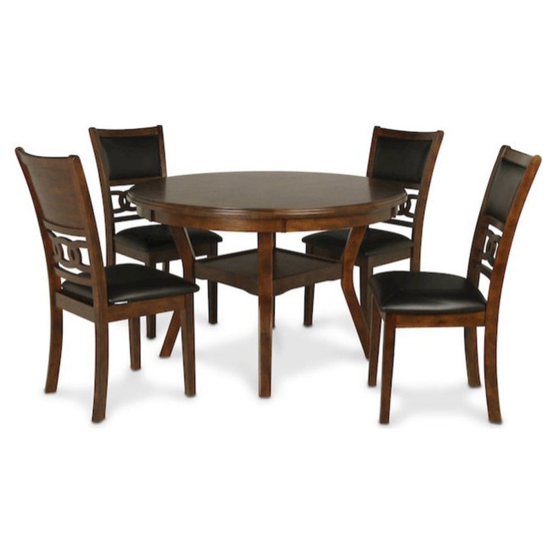 The elegant Gia 5 Piece Dining Table and Chair Set is built with durability and comfort in mind. This dining set provides spacious seating for four, and a handy storage shelf located under the table top to store dinnerware or decor. The dining table apron, table legs and dining chair legs are crafted of solid Rubberwood to add strength and stability. The distinctive reverse diamond Mindi wood veneer dining table top accents the beautiful wood grains which are highlighted by the multi-step rich brown finish. The set includes four comfortable dining chairs with black pu upholstered seat cushions and backrests. The final touch is Gia’s signature interlocking chain design on the chair back, giving this welcoming dining set a touch of sophistication. The result is a casual, contemporary dining set, perfect for your dining room or kitchen.