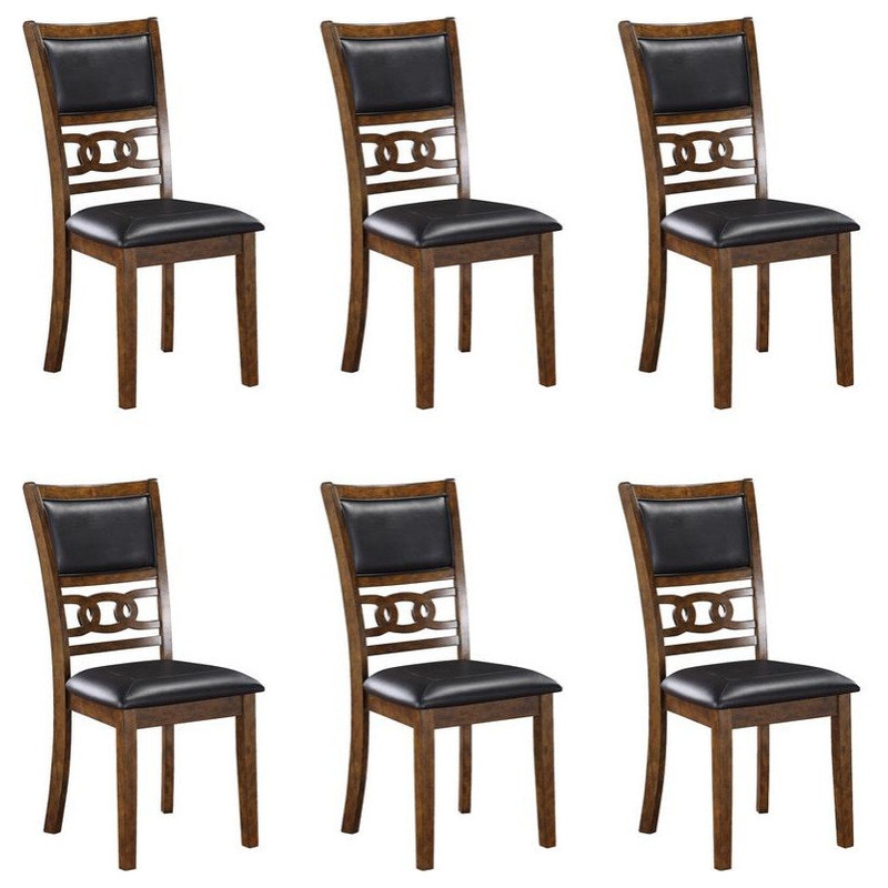 Enhance your dining space with this set of two New Classic Gia Wood Dining Chairs in a rich brown finish. Crafted from solid Rubberwood and Mindi veneers, these chairs offer a perfect blend of durability and aesthetic appeal. The warm brown finish, achieved through a multistep process and clear coat, highlights the exquisite wood grain. Designed for comfort and longevity, the chairs feature black PU upholstered cushions and backs supported by sturdy solid wood legs. The transitional style, characterized by interlocking chain chair back detail, tapered legs, and clean lines, seamlessly complements any dining room decor. Assembly is a breeze with all necessary hardware and clear instructions included. With a one-year warranty, these dining chairs are a practical and stylish addition to your home. Invest in quality and style with the Gia Wood Dining Chairs.