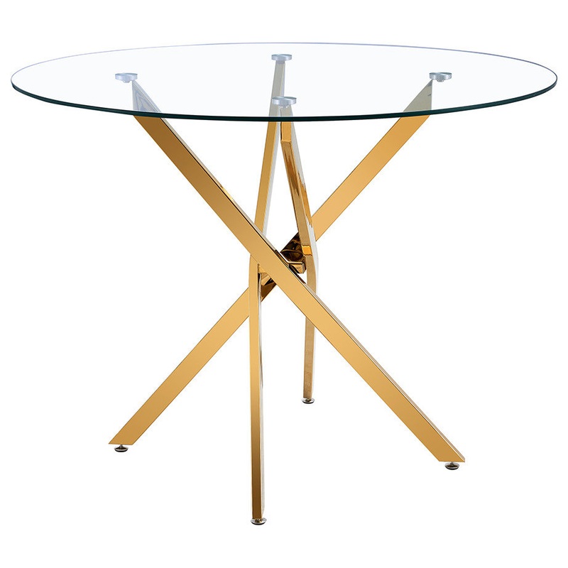 Modern dining table with tempered glass top and polished stainless steel in gold