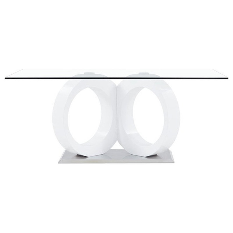 Introducing Stacey White Glass Top with Circular Base Dining Table by Global Furniture USA. With its artistic design and geometric style base this elegant dining table is just what your dining room needs. Featuring sculptural legs in a white gloss finish, rectangular tempered glass top with a chromed base plate to finish the look. You will enjoy entertaining friends and having family dinners in style.
