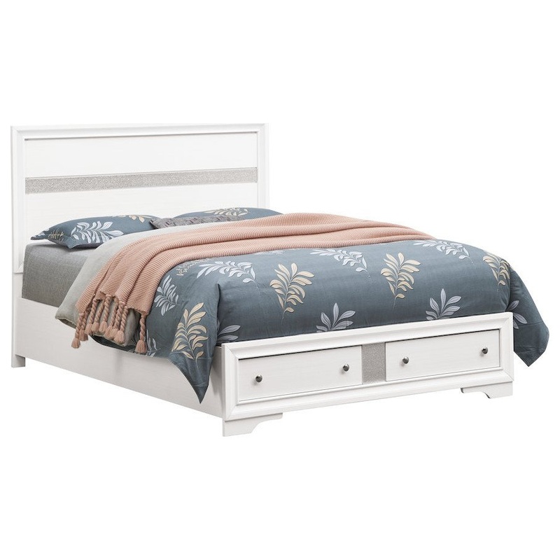This Queen Storage Bed by Glory Furniture merges practicality with a modern design, making it an excellent choice for enhancing your bedroom. The pristine white laminate finish features a trendy wood grain texture, providing a clean and functional aesthetic. It is intuitively designed with two deep drawers beneath the bed for storing blankets, clothing, and other essentials, helping you maintain an organized living space.Measuring 50H X 63W X 84D, this bed is suited for various room layouts while offering a spacious sleeping area that promotes comfort. The thoughtful design elements include tarnish-resistant nickel handles that not only enhance durability but also add a sleek touch to the overall look.Adding to the charm is the silver acrylic trim, which beautifully mimics the sparkle of crystal, giving it a captivating appearance. Its fully slatted base eliminates the need for a boxspring, making it perfect for those who value both style and functionality in their furniture.