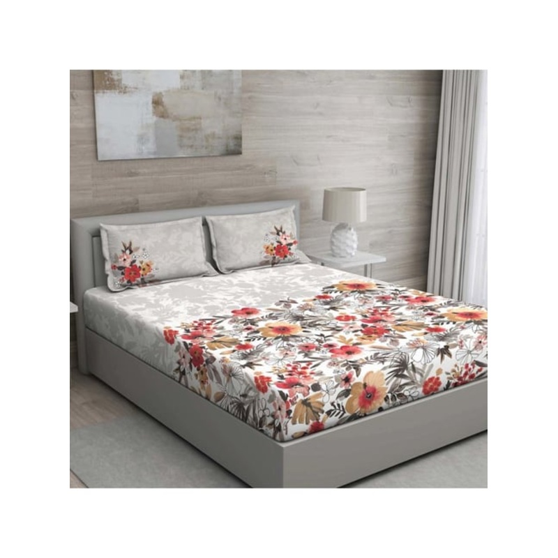GM ‘Matthiola’ Grey & Red Cotton 150 TC Double Bedsheet with 2 Pillow Covers