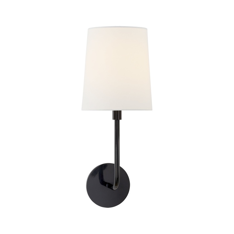 The Go Lightly Sconce is enviably soft and elegant, witha silk shade supported bya slender arm in your choice of charcoal, china white or gild finishes.Stylish in its simplicity,this fixture provides a generous amount of light without drawing attention to