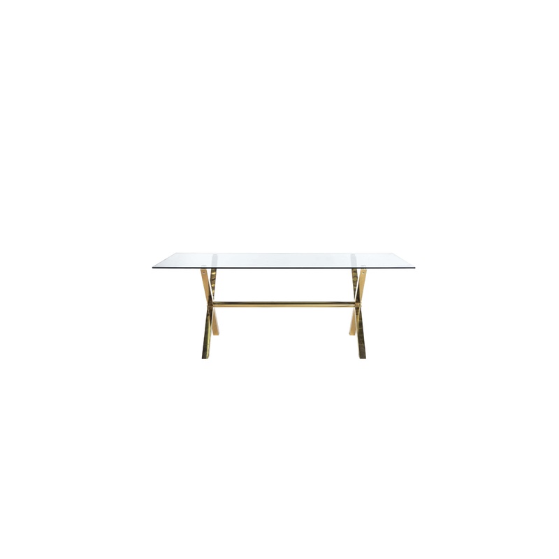 Ultra modern table. Very modern and edgy. 79" Table. Model # (MPN)GBEVERLY-DTProduct ID105429734Manufactured ByPangea HomeSold ByHouzzSize/WeightW 79" / D 37.5" / H 30" / 157 lb.ColorGold/ClearMaterialsTempered Glass, High Polished Gold Steel LegsAssembly