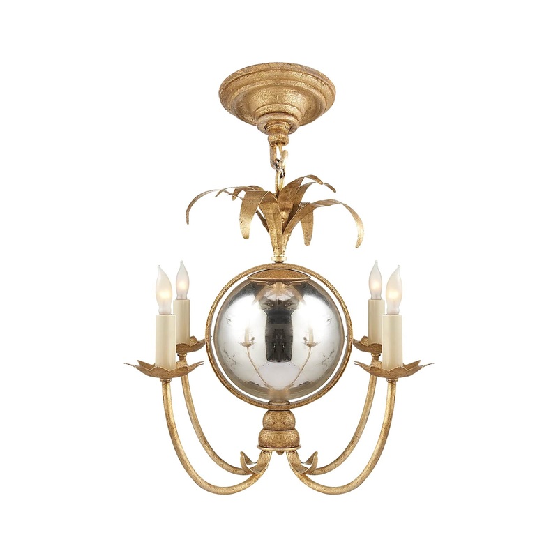 The Gramercy Mini Chandeliercombinesa stately traditional silhouette with a smallerprofile that excels where space is limited.Thischandelier features leafy accents and a gleaming central sphere for a whimsical, nostalgic touch.Astriking gilded iron finish