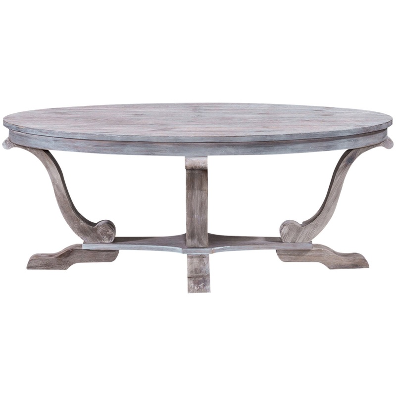 Pine solids and white-wash finish define this classic oval Greystone Mill cocktail table. The finish with wire brushing provides a unique appearance that will make this a conversation piece in any living room. These occasional tables are constructed with h