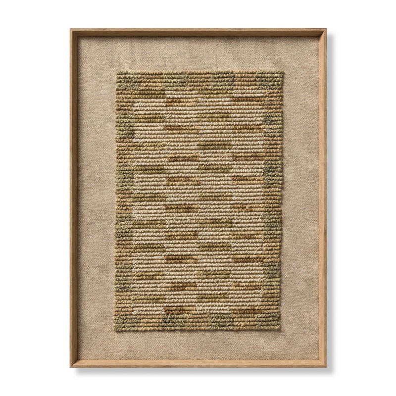Ready-to-hang Descanso wall art from Amber Lewis x Loloi features a hand-tufted wool textile with a broken stripe pattern in an earth-toned palette, measuring 42 x 32. The artwork is made in India and custom-framed in Dallas, Texas.