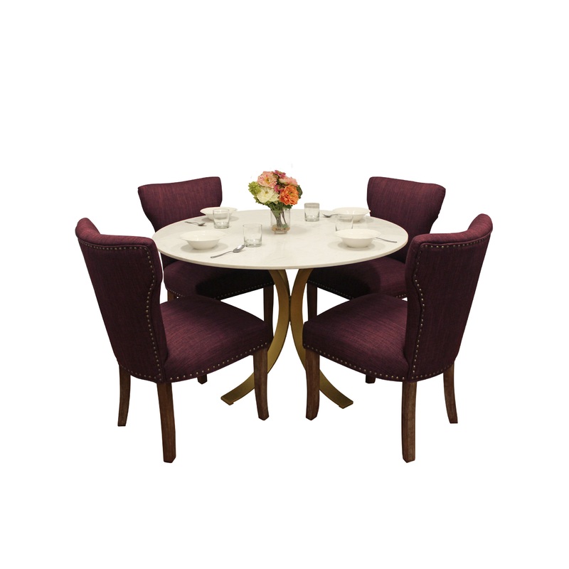 This elegant 5-piece dining set is the perfect centerpiece for small gatherings. It features one 48″ marble top dining table with a brass-finished iron base, and 4 matching upholstered chairs. The ivory coloration of the genuine marble is sure to inspire delight. Each chair features purple linen weave upholstery and nail trim, accented by solid wood legs.
