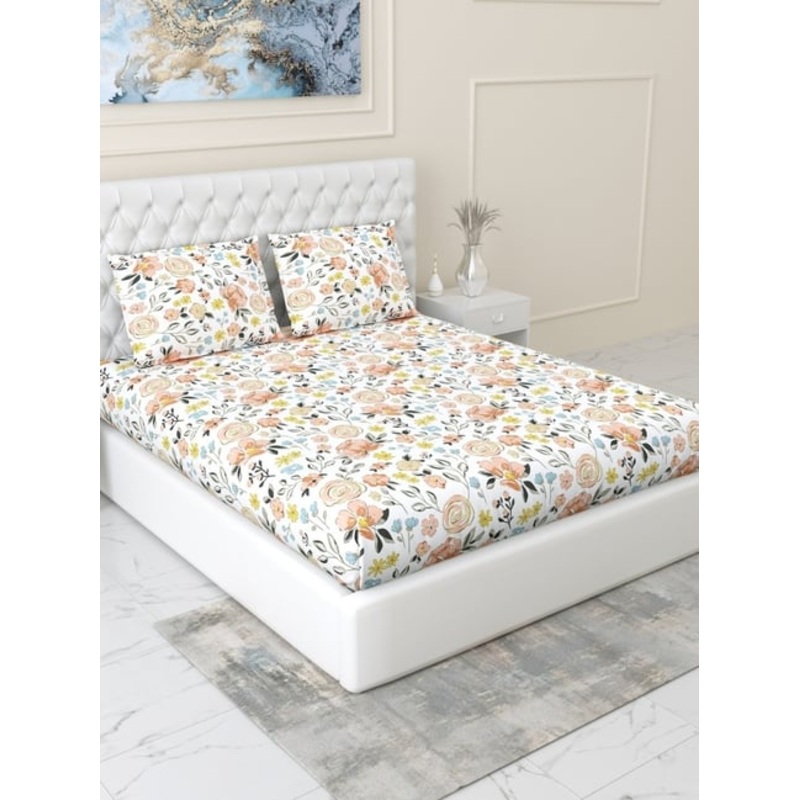 Haus & Kinder Cotton Multicolour Island Bloom 144 TC King Fitted Bedsheet with 2 Pillow Covers
