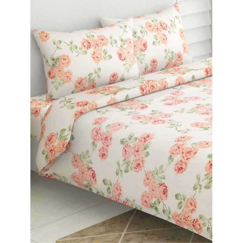 Enhance the sophistication of your home interiors by adorning your bed with this set of 1 blushing blossom printed king bedsheet and 2 pillow covers from Haus & Kinder. Crafted with cotton having a cotton weave and a thread count of 144 TC, it features shr