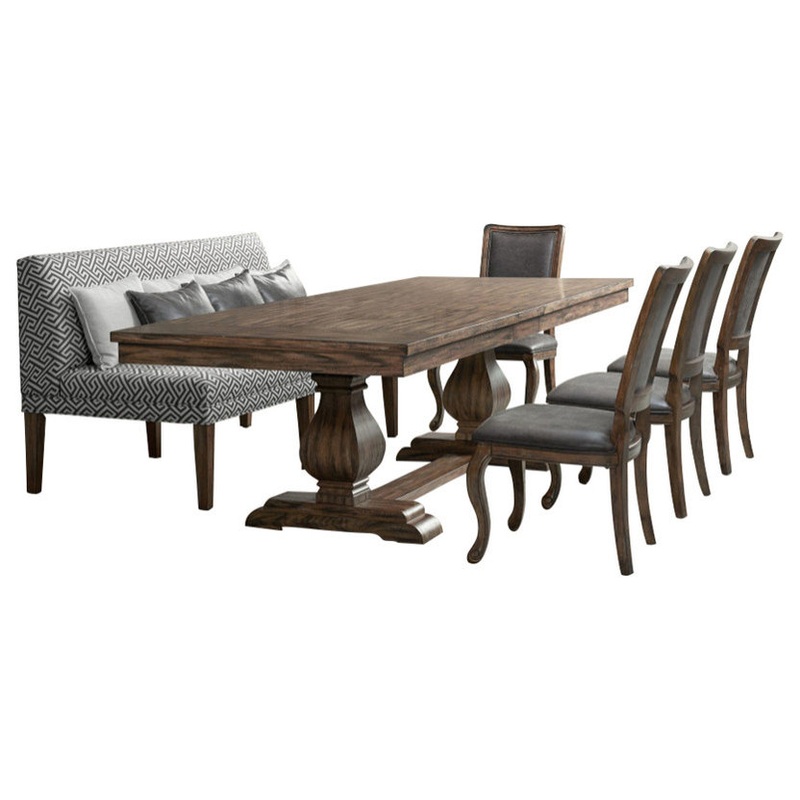 The Picket House Furnishings 6PC Dining Set will look fantastic in your home! This set includes a table, four side chairs and a settee. This table is perfect for entertaining several people thanks to not one, but two removable, extension leaves. With both leaves in, the table can easily go from 84″ wide to 108″ wide; giving you more than enough elbow room. This standard height table has a double pedestal base, instantly adding extra flair to this already stylish set. These chairs feature a faux leather upholstered seat and back in a rich, chocolate color. The faux leather is distressed, instantly adding character and charm to this chair duo. The front legs are curved, adding extra flair to these already stylish chairs. This settee adds a pop to your dining room thanks to its transitional print. This settee includes seven pillows total, instantly dressing up your dining room.