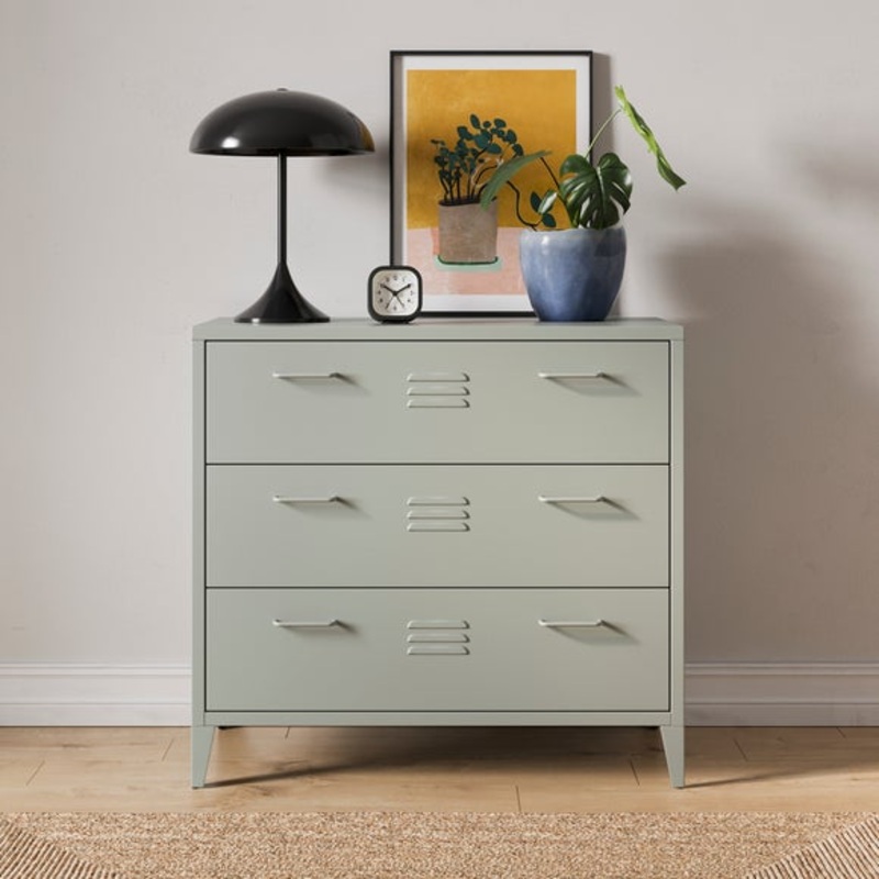 Locker StyleAdjustable LegsEasy AssemblyThe Helga chest of drawers combines industrial-inspired design with everyday functionality. Built from strong metal, it features three spacious drawers that glide smoothly, offering ample room for clothing, accessori