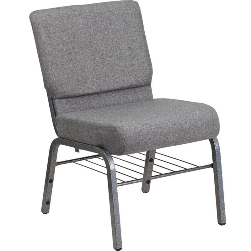 day seminar, serving a 10 course meal or delivering your most inspirational sermon. This chair offers an advantage over pew seating with the flexibility of creating different seating configurations.The chair’s cushioned back and 4 inch thick seat are generously padded with CA117 fire retardant foam and covered in durable fabric upholstery. The seat has a waterfall edge that reduces pressure on your attendees’ legs. A convenient book pouch on the back of the chair keeps seminar materials, bibles or hymn books readily available and a book rack under the seat gives everyone a place to store their personal belongings. Built-in ganging brackets connect your chairs and maintain nice, straight rows. Its sturdy 16 gauge steel with gracefully angled legs, has been tested to hold up to 800 pounds and plastic rocker glides protect your floor by sliding smoothly when you need to move the chair.This Church Chair is an excellent option for hotel lobbies, banquet halls, conference facilities and worship centers.