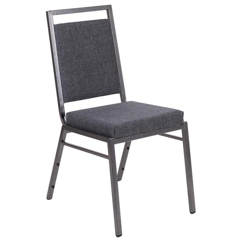 Refresh your reception venue with this elegantly styled ballroom chair. The commercial grade banquet chair with square back design fits well in formal and casual settings from wedding ceremonies to corporate meetings and awards banquets. This standout hospitality chair can be used as is and still command attention or be dressed up for formal events by placing a chair cover over it. Accommodate everyone who visits your venue with this sturdy banquet stack chair with CA117 fire retardant foam cushioning, and 16-gauge steel, powder coated frame, that has been tested to hold up to 600 pounds. Double support braces reinforce the frame to give it great strength and durability. For high use venues, the beautiful frame will be maintained with the included bumper guards that prevent scratches on the frame when stacked (up to 15 high) and non-marring floor glides protect your flooring by sliding smoothly when you need to move the chair. This modern upholstered banquet chair is ideal for churches, banquet halls, wedding receptions, training seminars, hotels and convention centers. Adding metal banquet chairs to your home’s dining table will add an elegant appearance to your dining room or kitchen.