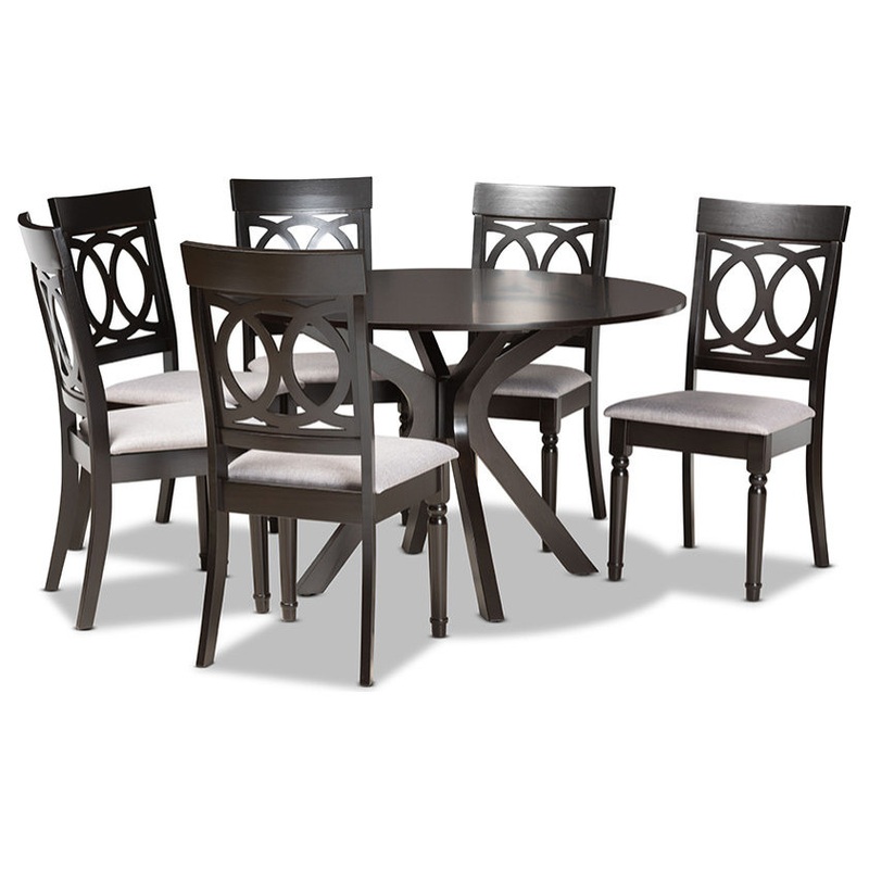 Enhance your dining space with the elegant style of the Herling dining set. Made in Malaysia, this wooden set includes six dining chairs and one table. Each chair is upholstered in a light fabric that complements the rich dark brown finished wood. Designed with both comfort and style in mind, each chair features a plush foam-padded seat, as well as an exquisite cut-out design on its back. Requiring assembly, the round tabletop provides ample elbow room for each member of the table. Well suited for both casual meals and formal dining, the Herling dining set is an excellent upgrade to the modern home.