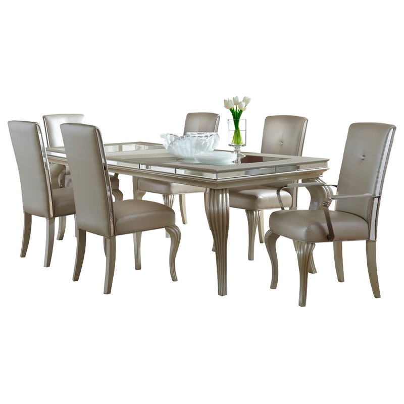 Revitalize your dining area with the ultra-chic Hollywood Loft Dining Room Set. This stunning set can be used in virtually any dining space, from transitional to modern. Each piece of this set demonstrates exquisite craftsmanship and gleaming details that bring a Hollywood-inspired look full of glamour to your dining room. Luxurious vinyl and mirrored trims on both the table and dining chairs add a dazzling glow.