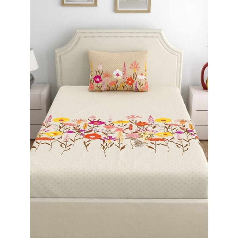 Home Ecstasy Frost Petal Cotton Floral 140 TC Single Bedsheet with 1 Pillow Cover