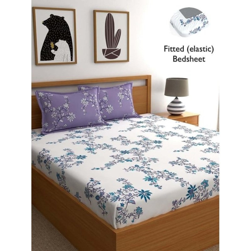 Home Ecstasy Lavender Cotton 140 TC King Fitted Bedsheet with 2 Pillow Covers