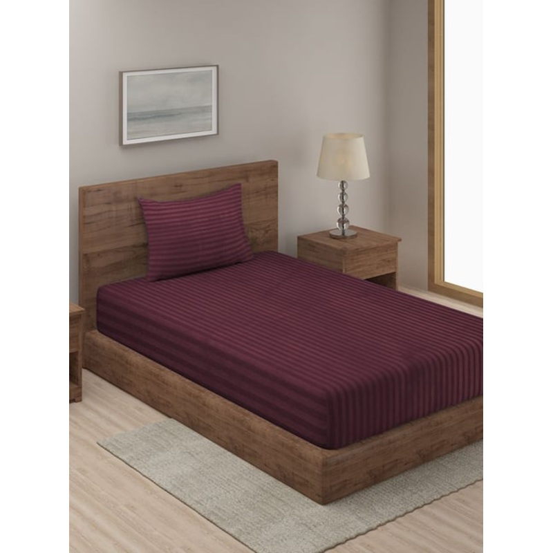 Hosta Homes Stripes Purple 280 TC Poly Satin Fitted Single Bed Sheet with 1 Pillow Cover