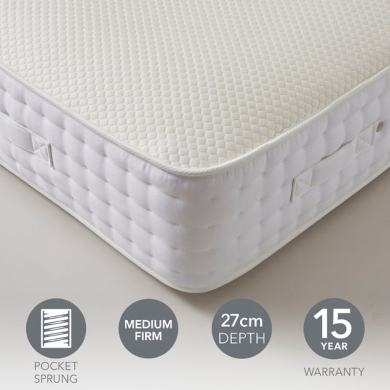 50mm Memory Foam TopPocket Spring HybridButterfly ClipsMedium to Firm SupportSuitable for all SleepersCarefully crafted, this mattress is a masterpiece of comfort and sophistication, blending 1000 individually encased pocket springs and 2000 mini tablet sp