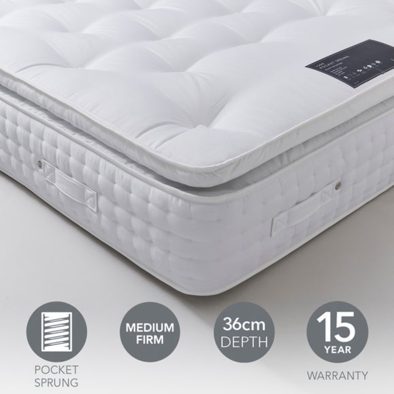 1500 Pocket SprungPillow Top added cushioning layerMedium Support ideal for front and back sleepers100% Cotton Cover added breathabilityEco-polyester Filling made from recycled polyester fibresWool, Silk and Cashmere Layer temperature regulating and improv