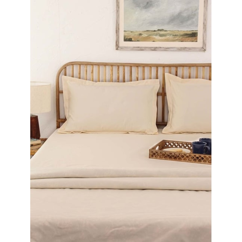 House This Sesame Cream 150 TC Cotton Fitted Bedsheet with 2 Pillow Covers