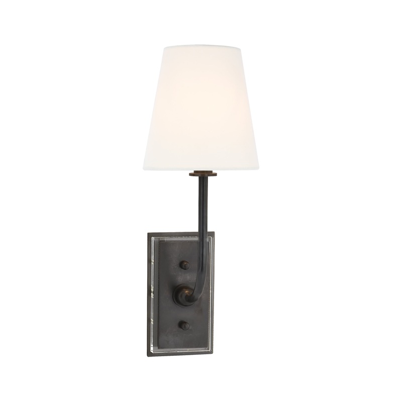 The Hulton Sconce by Thomas OBrien pairs classic poise with contemporary refinement. Its slender brass arm arcs gently from a rectangular backplate, supporting a crisp tapered shade that diffuses soft ambient light.Refined detailinglike the subtly curved s