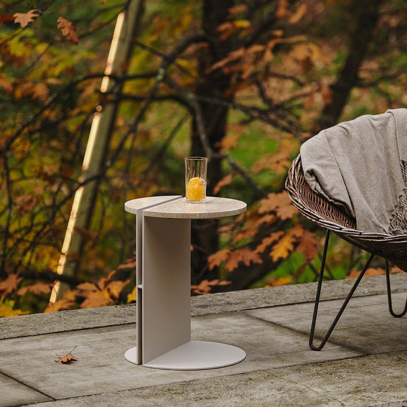 Industrial Travertine Stone Metal Side Table LISKA features a beige travertine top and sturdy metal base an elegant match of natural stone and industrial design.