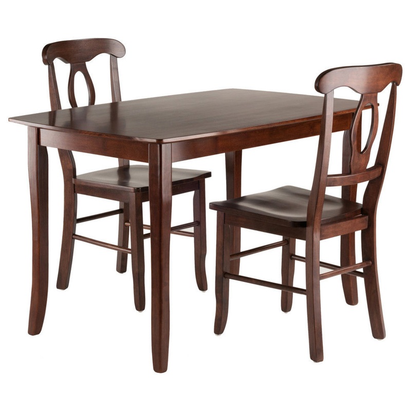 The Inglewood 3-Piece Dining Table Set is sure to be the centerpiece of your dining room or eat-in kitchen. The table top has a softly curved profile supported by a frame with contoured, tapered legs that give it a graceful, refined look. The set comes with two Renaissance Chairs that feature an elegant keyhole back design and contoured seats. Together, they bring a touch of French country farmhouse into your home. Both table and chairs are made of Solid Wood for longlasting beauty and durability. The rich Walnut finish brings out the warmth of the natural wood grain.