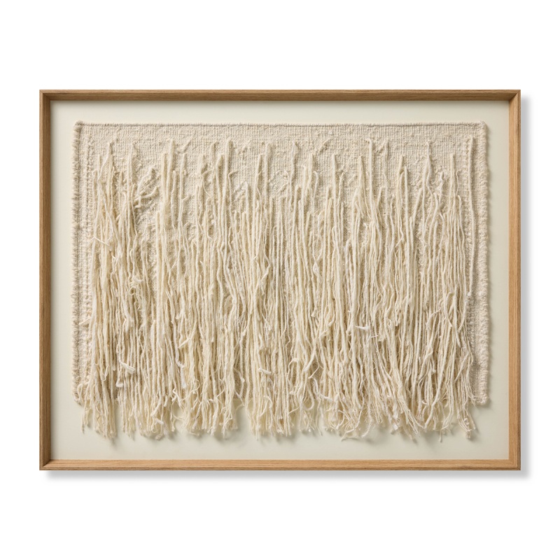Ivory Falls is large wall art featuring a cascade of threadwork that adds texture and movement to any room, a beautiful complement to organic modern and boho home decor. The neutral ivory artwork is made in India of jute, wool, and cotton and custom framed