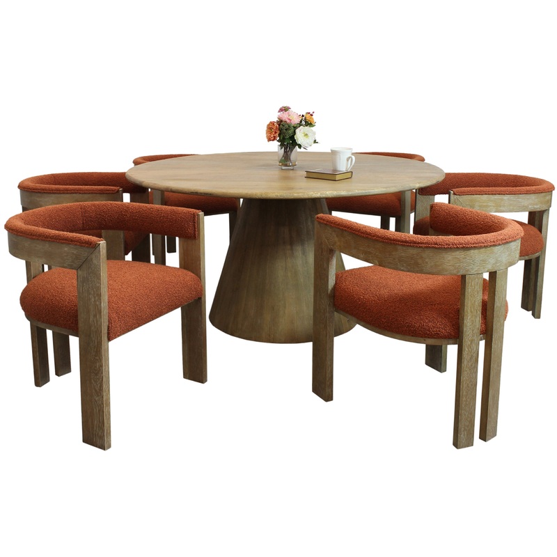 This 6-person dining set ties together contemporary craftsmanship with an elegant modern twist. It includes one 60″ round solid wood dining table on top of a pedestal base, and 6 rust colored solid wood side chairs. This table is hand-distressed to bring out the natural wood grain finish. Each chair is made of solid wood with a matching finish and is upholstered in premium boucle fabric for a touch of class.