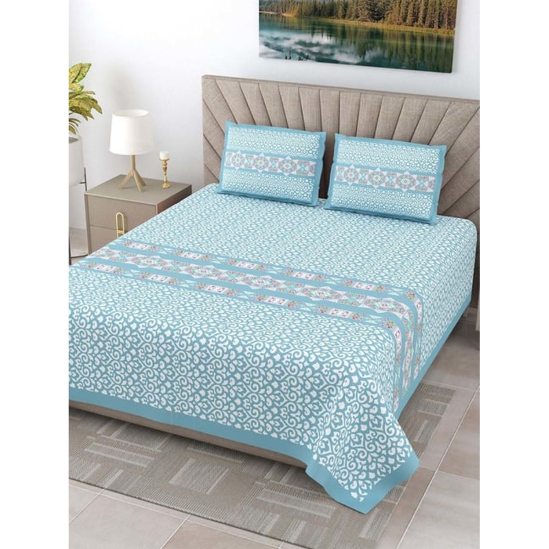 GR4670178552JaipurFabric Blue Pure Cotton 240 TC Ethnic King Size Bedsheet with 2 Pillow Covers