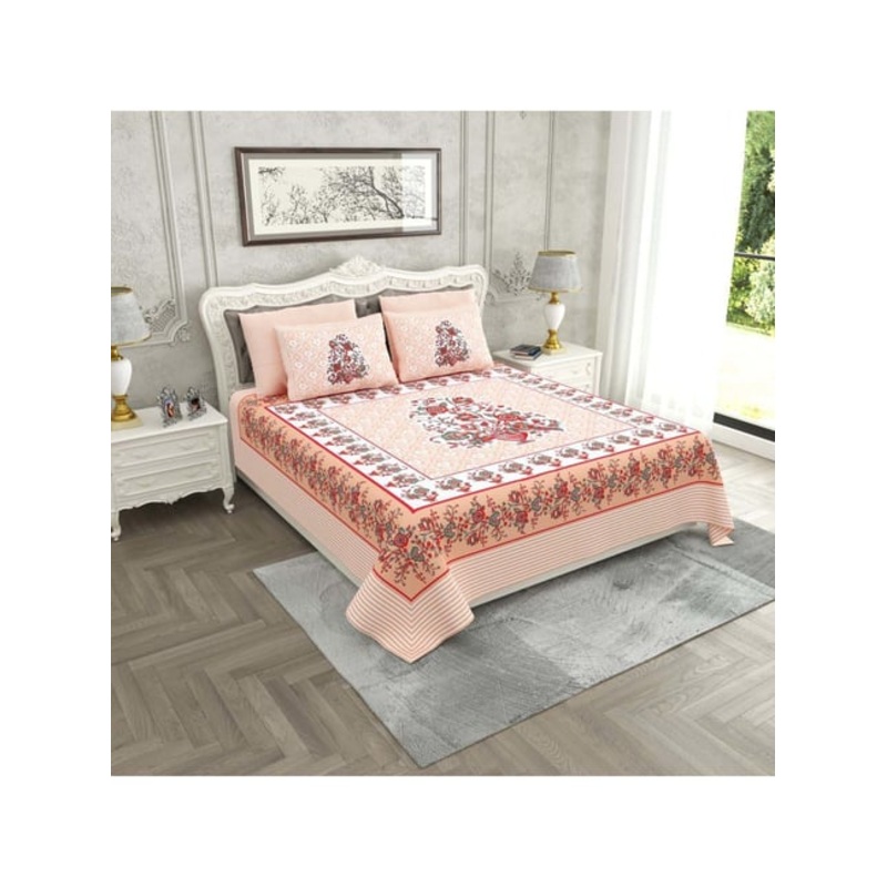 JaipurFabric Soft Peach Pure Cotton 280 TC Jaipuri Gamla King Size Bedsheet with 2 Pillow Covers
