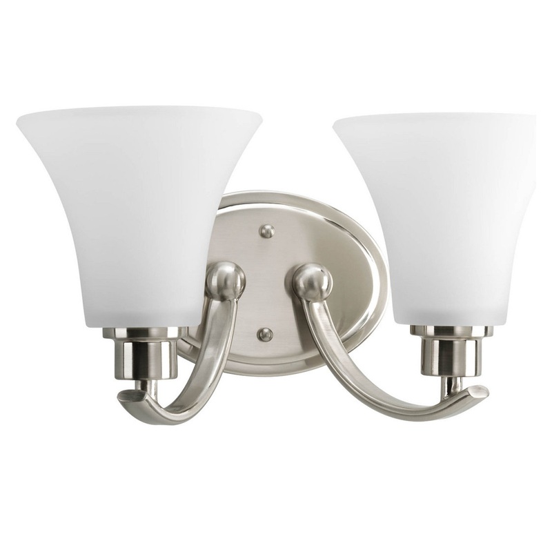 Gleeful simplicity defines the Joy Collection. Refreshing and fashionable, arcing forms of metal and fluted glass shades are enhanced by a classic Brushed Nickel finish. Two white etched glass complete the look and allows you to coordinate well with other fixtures from this collection. Bring joy into your heart and into your home with this wonderful two-light bath fixture.