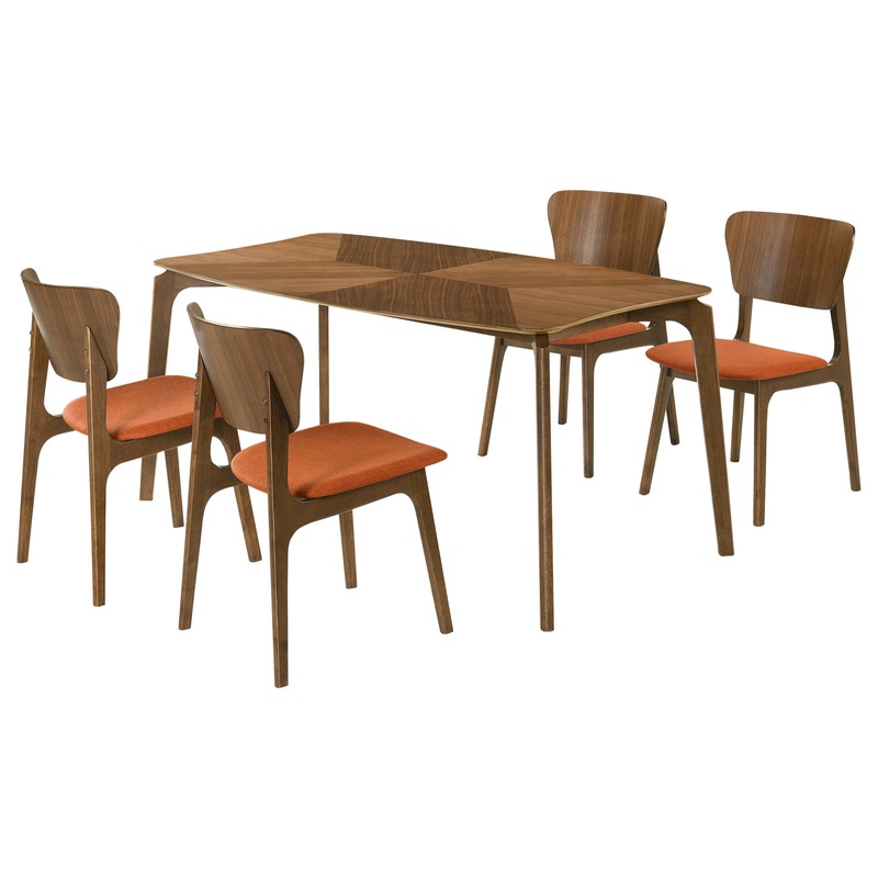 The Kalia 5-piece Wood Dining Set from Armen Living will enhance any dining space. The dining table features softly curved edges to maintain a modern and inviting edge in any room. Included in this dining table set is 1 dining table and 4 dining chairs. The tabletop is enlivened with natural grains of wood that are juxtaposed at an angle to bring rich character. Inspired by mid-century modern design, the dining chairs embrace a soft and inviting profile. They feature a gracefully curved and contoured back that lends sturdy back support. Complemented with beautifully curved and angled legs, the chairs vouch for a sculptural and charming presence. They feature a generously padded seat to provide the perfect combo of style and comfort. This dining set is crafted in a combination of engineered and rubberwood to provide durability and easy maintenance for your daily meals and formal dinners. This dining set is available in your choice of a walnut wood finish with charcoal, blue, or orange fabric upholstery or a gray finish with gray fabric upholstery.