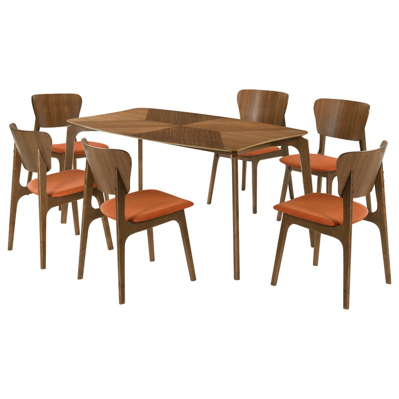 The Kalia 7-piece Wood Dining Set from Armen Living will enhance any dining space. The dining table features softly curved edges to maintain a modern and inviting edge in any room. Included in this dining table set is 1 dining table and 6 dining chairs. The tabletop is enlivened with natural grains of wood that are juxtaposed at an angle to bring rich character. Inspired by mid-century modern design, the dining chairs embrace a soft and inviting profile. They feature a gracefully curved and contoured back that lends sturdy back support. Complemented with beautifully curved and angled legs, the chairs vouch for a sculptural and charming presence. They feature a generously padded seat to provide the perfect combo of style and comfort. This dining set is crafted in a combination of engineered and rubberwood to provide durability and easy maintenance for your daily meals and formal dinners. This dining set is available in your choice of a walnut wood finish with charcoal, blue, or orange fabric upholstery or a gray finish with gray fabric upholstery.