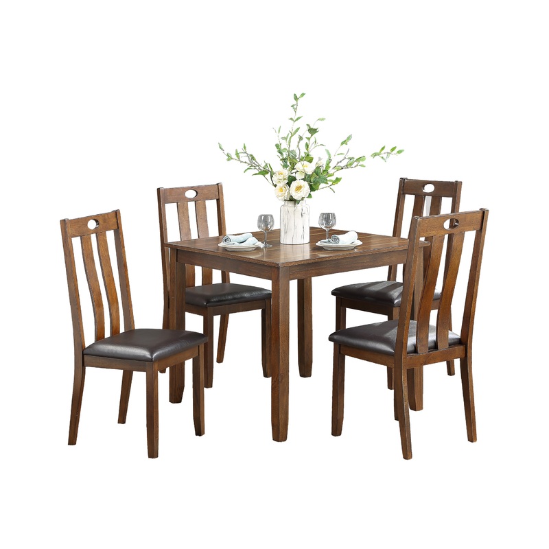 The transitional styling of the Kaydee Collection is paired with convenience to create a dining set scaled for your casual home. The 5-piece collection includes a traditional dining height table and four chairs. The acacia veneer of the group is finished with a medium brown and is complemented by the brown bi-cast vinyl of the chair seats.
