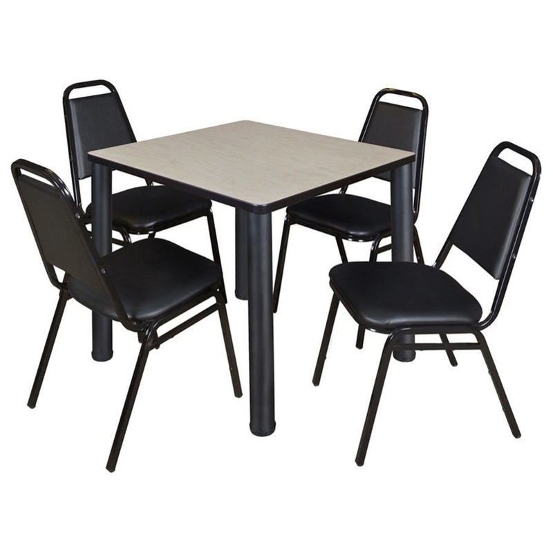 Give everyone more room with Kee tables. Kee post legs come four to a set and are adjustable so you have a steady table with no wobble. This versatile table and chair set includes one 30-inch square Kee table with black post legs and four Restaurant Stack Chairs. The table is constructed of a thermal fused melamine Maple laminate tabletop that is 1-inch thick and finished with a black T-Mold edge band. Laminates are scratch, stain and scald resistant and wipe clean easily. A sleek alternative to pedestal style bases, this set of post legs comes in a classic black to match any decor. The legs are constructed of tubular steel with adjustable glides on the bottom of the base. Inspired by the classic black Cafe look, the Restaurant Stack Chair is designed for use in almost any setting. The water-repellent vinyl seat and back easily wipe clean with a damp cloth. Reinforced cross-bracing on the black metal frame make this versatile stack chair suitable for every day wear and tear. It can easily be stored away in stacks of 12. All Regency chairs are backed by a 5-year limited manufacturer’s warranty on chair bases and frames and a 2-year limited manufacturer’s warranty on chair mechanisms and upholstery. Kee tables are backed by a 10-year limited manufacturer’s warranty.