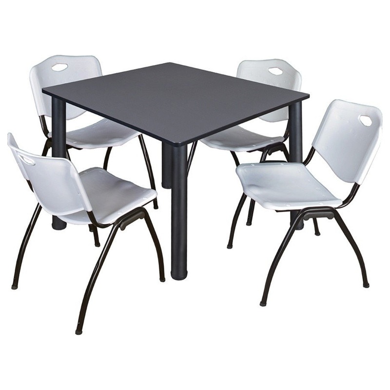 -Versatile table and chair set includes one 48-inch square table with black post legs and 4 Gray M Stack Chairs