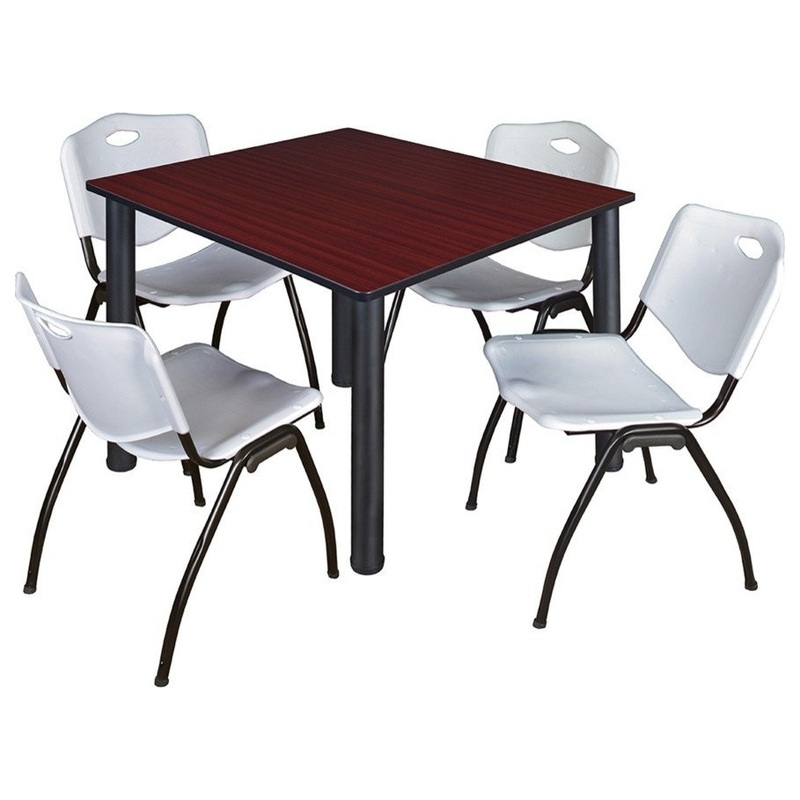 Give everyone more room with Kee tables. Kee post legs come four to a set and are adjustable so you have a steady table with no wobble. This versatile table and chair set includes one 48-inch square Kee table with black post legs and four Gray “M” Stack Chairs. The table is constructed of a thermal fused melamine Mahogany laminate tabletop that is 1-inch thick and finished with a black T-Mold edge band. Laminates are scratch, stain and scald resistant and wipe clean easily. A sleek alternative to pedestal style bases, this set of post legs comes in a classic black to match any decor. The legs are constructed of tubular steel with adjustable glides on the bottom of the base. The sturdy, lightweight “M” stack chair by Regency offers durability, style and value. Its black metal frame and contoured plastic seat and back are strong and easy to clean. This versatile stack chair easily stores away in stacks of 12 and features a built in handle for easy mobility. All Regency chairs are backed by a 5-year limited manufacturer’s warranty on chair bases and frames and a 2-year limited manufacturer’s warranty on chair mechanisms and upholstery. Kee tables are backed by a 10-year limited manufacturer’s warranty.