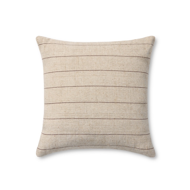 Keisha is a striped throw pillow from Amber Lewis x Loloi with a heathered beige and brown color palette, a versatile design for a range of home decor styles, from traditional to organic modern. The pillow cover is woven of jute and cotton in India and measures 18 x 18, a versatile size for living rooms and bedrooms.