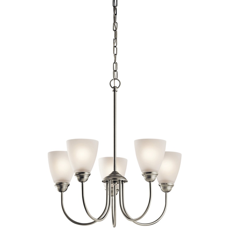 The Jolie 18.5" 5 light chandelier features a classic look with its Brushed Nickel finish and satin etched glass. The Jolie chandelier is perfect in several aesthetic environments, including transitional and traditional.Details:Product Type: Glass UpFinish