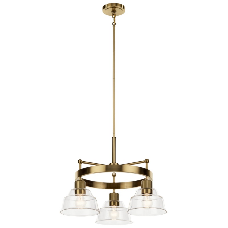 Brushed Natural BrassThe Eastmont 3 light chandelier is undeniably remarkable. A Walnut Wood wagon wheel with Polished Nickel arms set the scene for the Clear Glass double-tiered shades, making this one of our most sophisticated and versatile fixtures.Deta