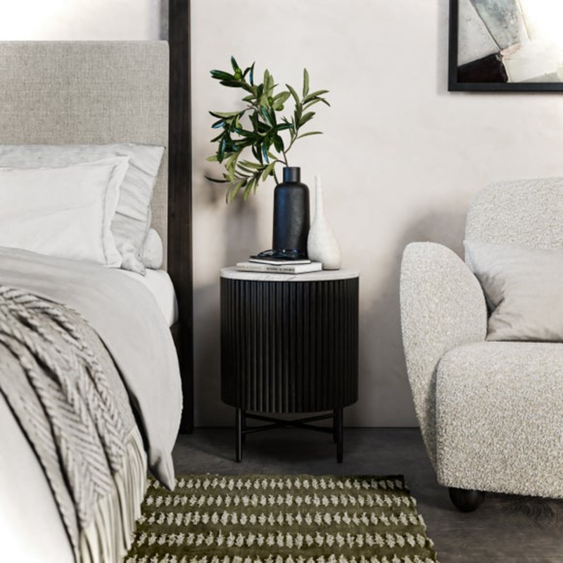 Keep your nighttime essentials close at hand with our Kiera Bedside Table. Made with durable mango wood and featuring a stylish marble top, this table is perfect for any bedroom. The rounded design and slatted front add a contemporary touch, while the storage cupboard provides ample space for books, tissues, and more.